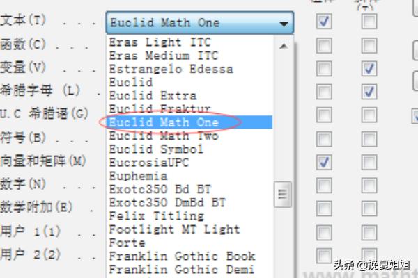 2、输入花体字:在字体栏中选择“Eulid Math One”字体。
