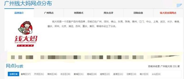 按照资料库记录,截止到目前为止,钱大妈在广州331家分店,并另附广州各区分店数量明细。