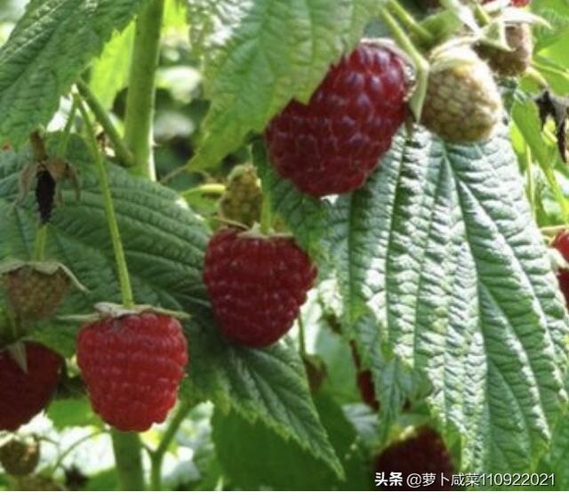 2、红树莓,多年生落叶灌木,当年生枝条绿色,基部有少量软刺。叶背银白色,嫩叶紫红色。浆果圆球形,深红色,芳香味浓,品质优良,含可溶性固形物7.5%~9%。6月下旬至7月上旬开始成熟。植株萌蘖力强,抗旱力强,丰产,单株丛可结果3公斤,每亩产750~1500公斤。 红树莓除适应在-40℃高寒下全裸越冬外,其抗旱耐瘠薄能力已超越了常规树莓品种。