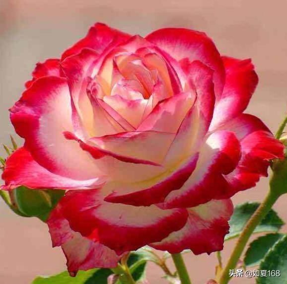 4. 红双喜 红双喜很浓香,颜色色彩的对比度非常大,基部的花瓣白偏浅黄,然后边缘,天冷的时候真的是血一样的红,或者是深玫红的。很妖艳、很震撼的,再加配上它的香气。非常吸引人,但红双喜对肥水有一定的要求,所以说如果新手种的话,可能说它一朵花开的很大,但是第二朵花上来的时候你要记得合理施肥。